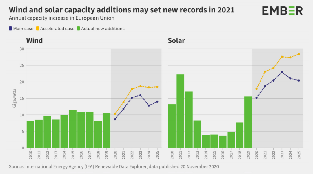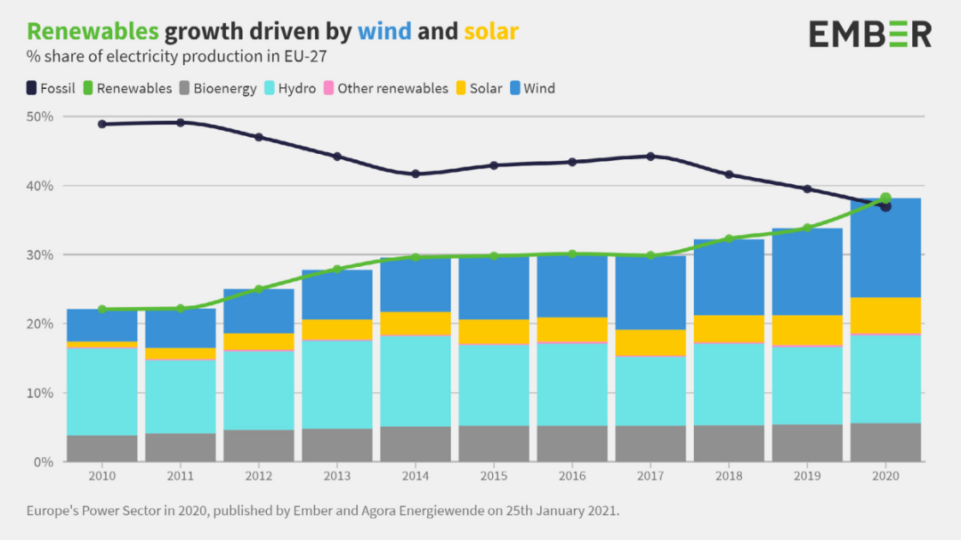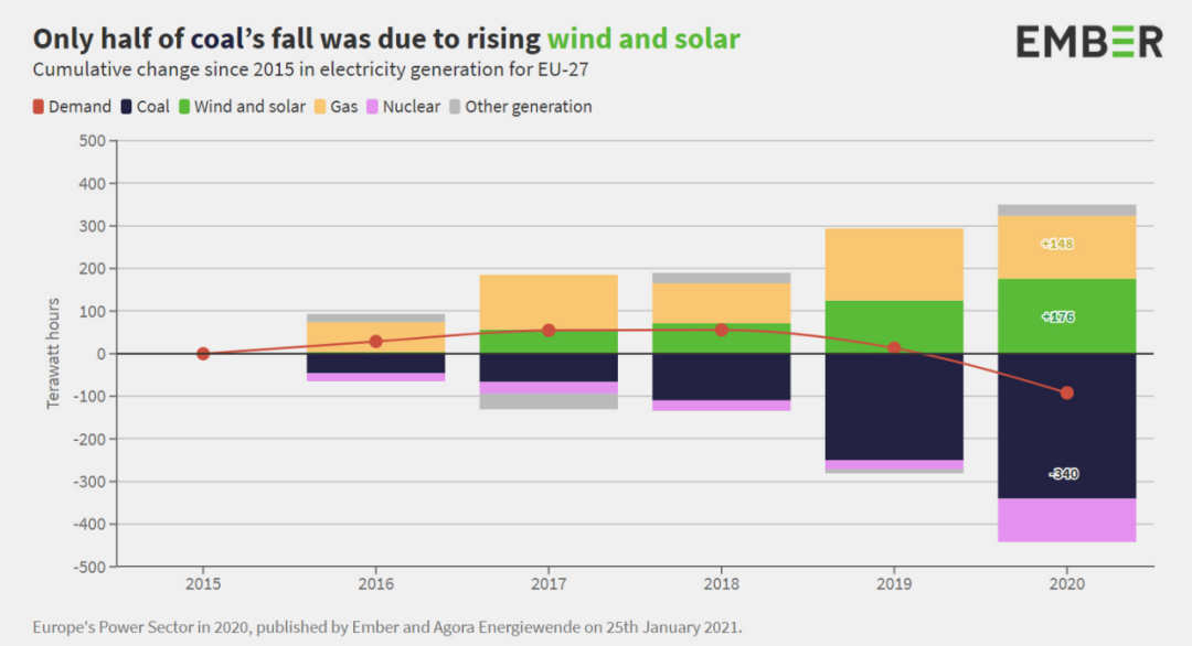 2020年,全球煤炭發電量出現了創紀錄的下跌,幅度達到20%,自2015年以來減少了一半。新增的太陽能和風能為此做出了貢獻,過去一年,太陽能發電量增長15%,風力發電量增長9%,它們共同創造了歐洲五分之一的電力。