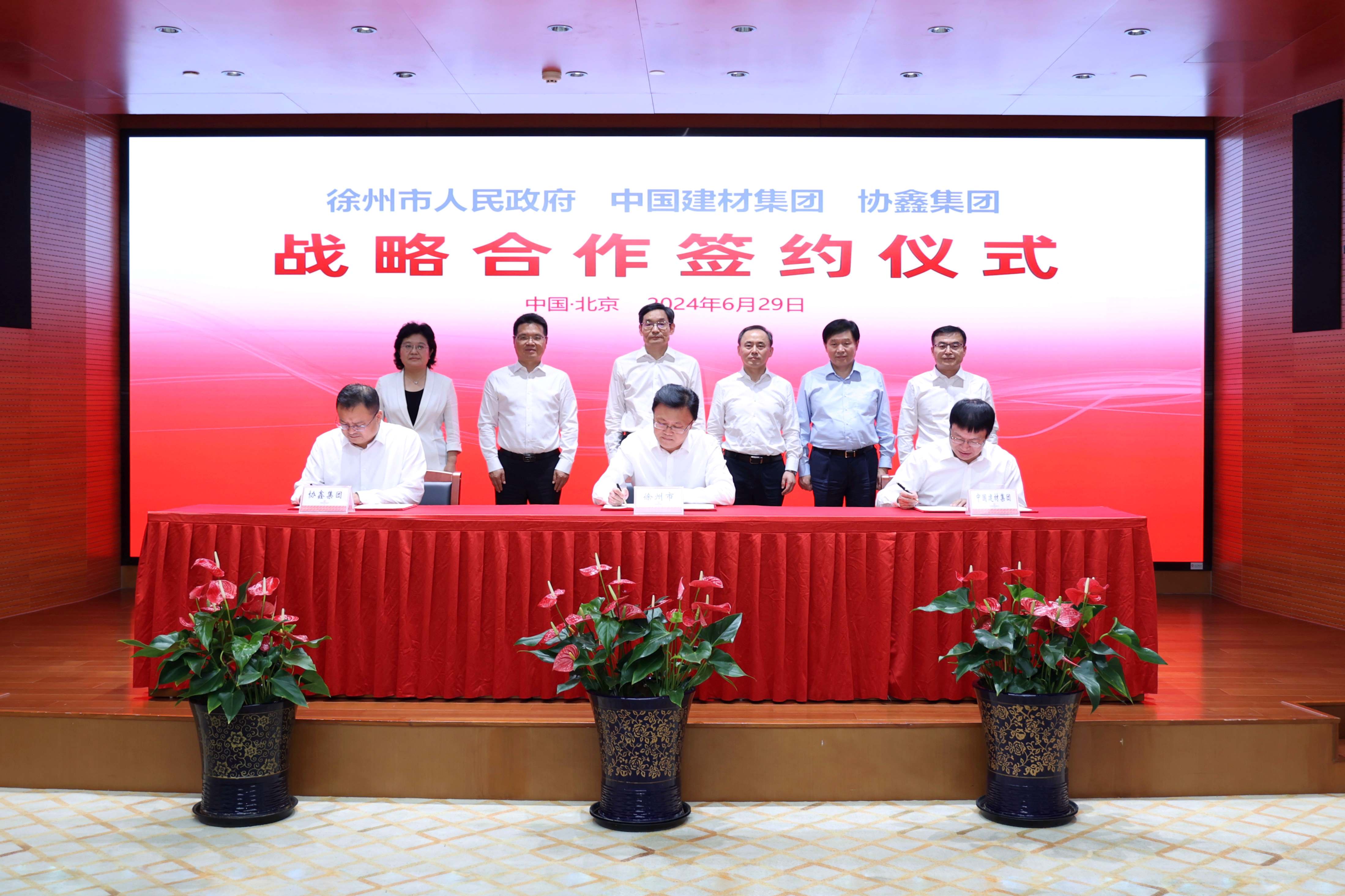 6月29日,江蘇省徐州市政府與中國建材集團、協鑫集團在京舉行戰略合作簽約儀式,中國建材集團黨委書記、董事長周育先,徐州市委書記宋樂偉,市委副書記、市長王劍鋒,協鑫集團董事長朱共山等領導出席并見證簽約。 根據協議,徐州市和中國建材集